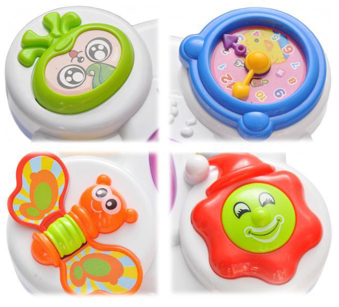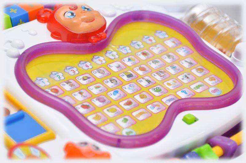 Zabawka literuje poszczególne słowa, zawiera wiele efektów muzycznych i świetlnych - to pełna atrakcji zabawka z panelem pełnym kolorów i dźwięków.